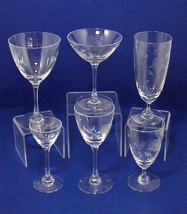 TIFFIN ''TIFFIN ROSE'' CRYSTAL STEMWARE: Forty-eight pieces to include 13 wine goblets, 10 champagne, 2 water goblets, 16 claret, 10 juice and 7 cordials. Pieces range from 5'' - 6 7/8''.