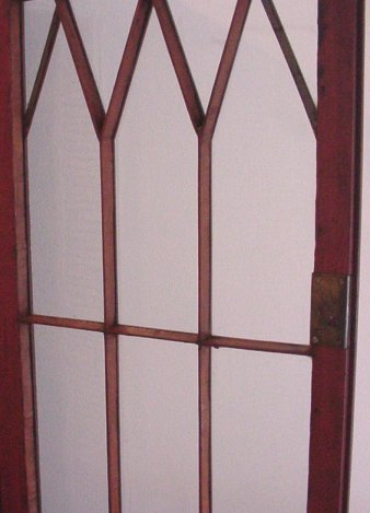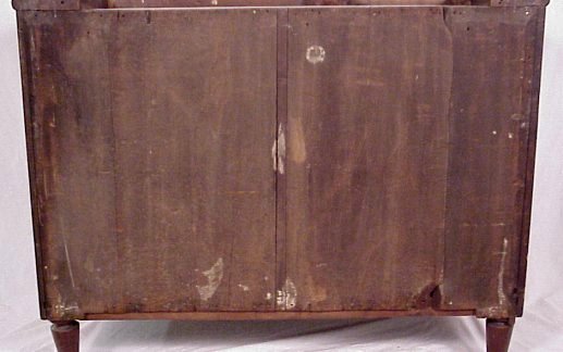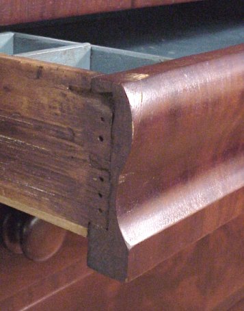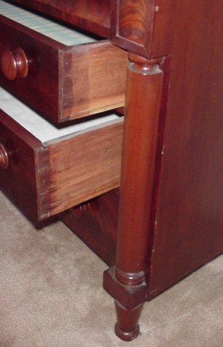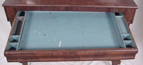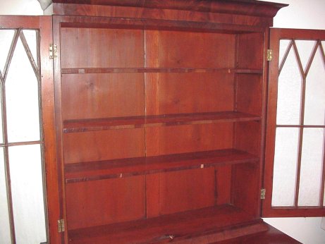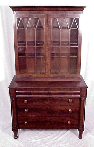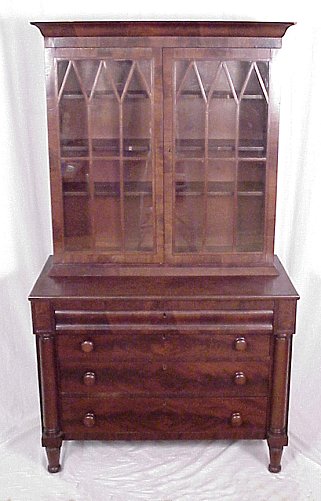 19TH C CROTCH GRAIN MAHOGANY SECRETARY BOOKCASE: Ca 1840. Highly grained mahogany. Individually glazed glass front doors on a step back bookcase, columnar stiles framed 4 drawers. 76''h. x 43''w.