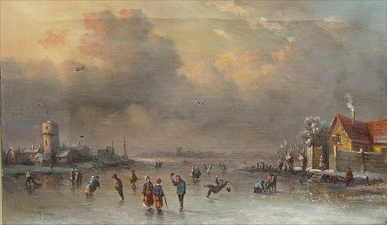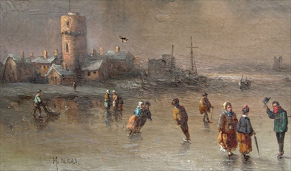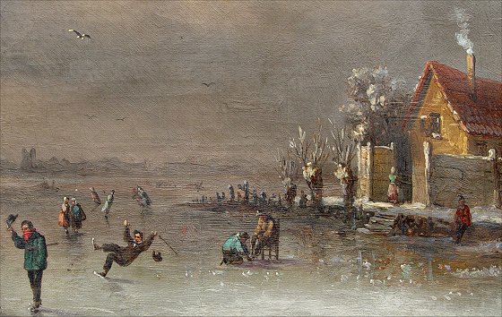 MAES, Hendrik, (Dutch, 1793-1873): Panoramic winter landscape with townspeople on a frozen river, O/C, 10 3/16'' x 16 1/8'', signed lower left H Maes. Condition - Several punctures in canvas in left margin with minor paint margin, upper middle margin, nail hole in right margin, nail hole with minor paint loss in lower margin, no visible in-paint, needs cleaning. Provenance: Former estate of Leslie Freedman, of Rockland County, New York.