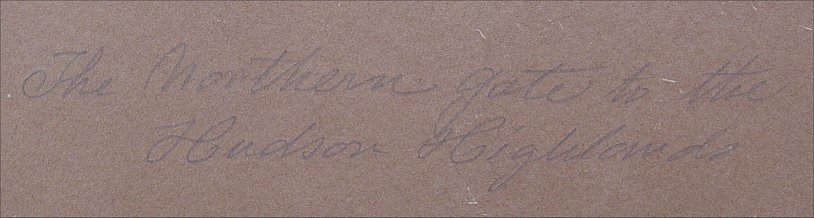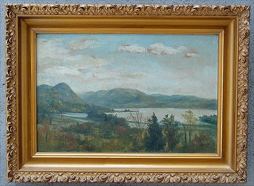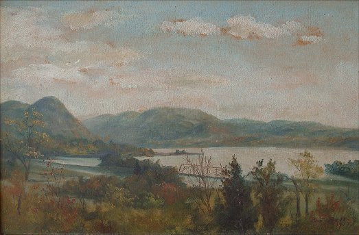 PELL, Ella Ferris, (American, 1846-1922): ''The Northern Gate to the Hudson Highlands'', O/B, 10'' x 15'', signed lower right, dated 1917, encased in period frame 14'' x 18 3/4''. Pell studied at the Academie Julian, Paris, and the Ecole Des Beaux-Arts, exhibited at the NAD, Brooklyn AA, Paris Salon, Boston AC, and the Pennsylvania Academy of Fine Arts. Ella Ferris Pell is believed to be the daughter of Stephen Pell, founder of the historical Fort Ticonderoga Museum. Stephen Pell was the grandson of William Ferris Pell who originally purchased the fort in 1816. Possible descendants of the founder of Pelham, NH. Condition - Several minor flecks of paint loss, needs cleaning.