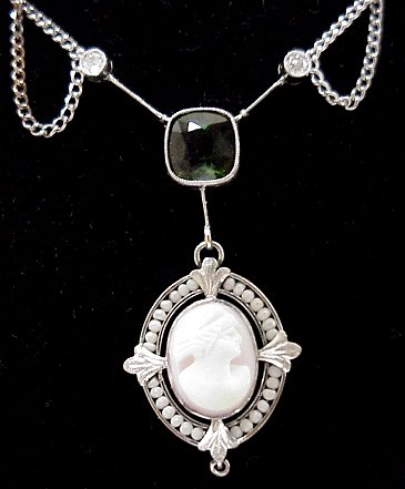 VICTORIAN CAMEO TOURMALINE LAVALIER: 14k white gold lavalier necklace bezel set with two diamonds, approx. 20pt total, to a bezel set 4ct cushion cut tourmaline, from which dangles the cameo circled by seed pearls. 16''l. with a 1 3/8'' drop to pendant, 6 grams. Est. $400/600**