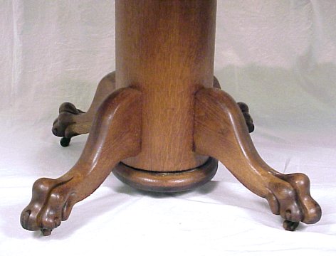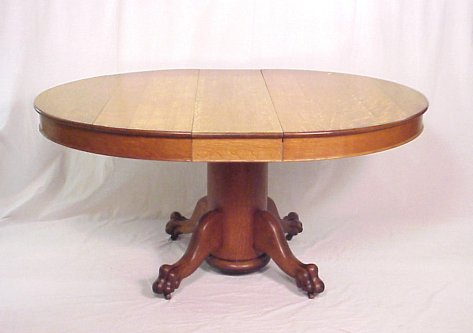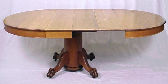 QUARTER SAWN OAK CLAW FOOT DINING TABLE: Includes 3 leaves. 52'' round table with three 12'' leaves. Center columnar pedestal with 4 support legs ending in claw and paw feet. Immaculate finish. 32'' h. on castors.