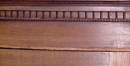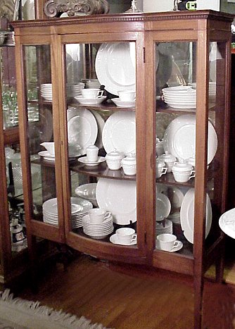 MAHOGANY BOWED CENTER CHINA CABINET: Dentil molding follows the lines of the cornice. Front center glass door is bowed. Interior shelves follow the curves of the cabinet. Please note some loss of thin pipe molding. 61''h, 43''w, 15 1/2''deep at the widest.