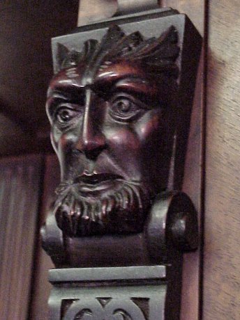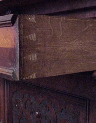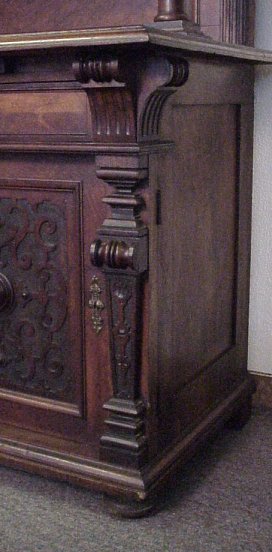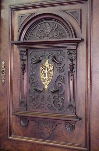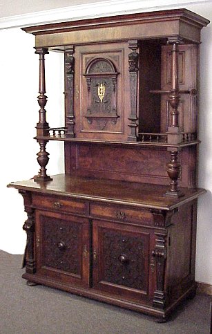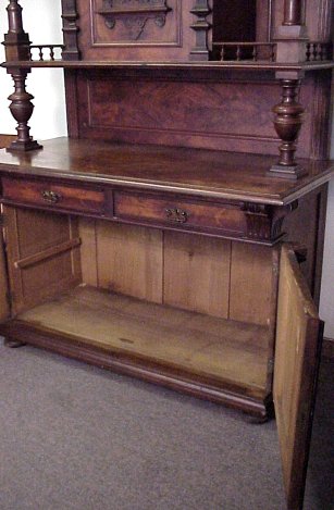 19TH C BURLED WALNUT & MAHOGANY CARVED SIDEBOARD: Enclosed upper center section flanked by open, galleried shelving. Fabulous carving and detail. Warm rich patina. 7 1/2''h, 57''w, 28''deep. Est. $1200/1500**