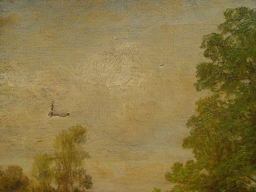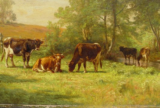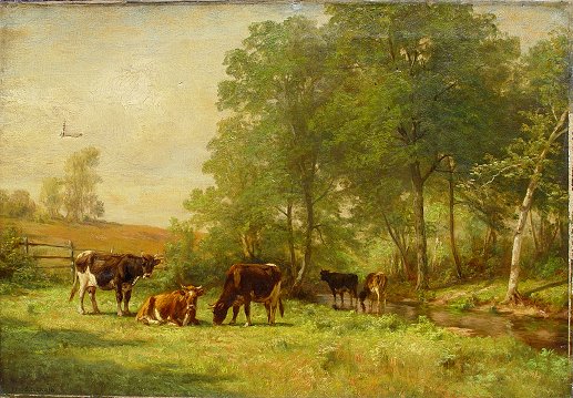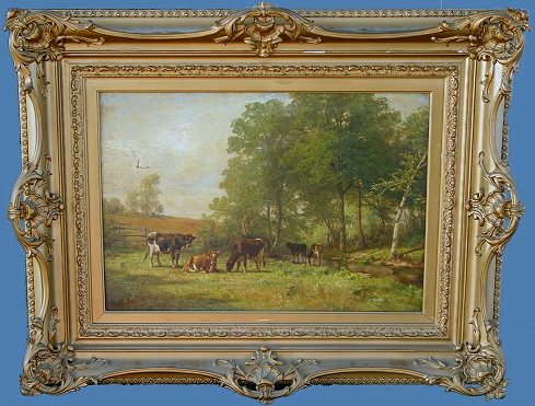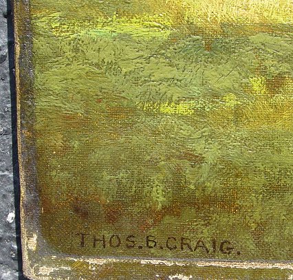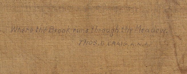 CRAIG, Thomas Bigelow, (American, 1849-1924): ''Where the Brook Runs Through the Meadow'', O/C, 18'' x 26'', signed lower left, titled and signed verso, encased in period gilded gesso pierce carved frame, frame has been over-painted with gold and needs minor restoration but overall in very good condition, 30'' x 38'' overall. Condition - Painting has two punctures in upper left quadrant, will need cleaning. Some paint loss in margins under frame. One of the finest Craig paintings to ever come to auction!