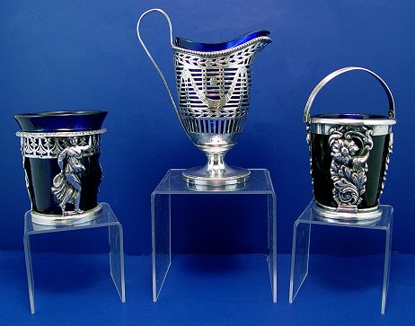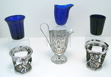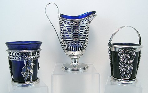 3 PIECE GROUP COBALT GLASS IN CONTINENTAL SILVER: Flower form sugar basket, Neoclassical cream pitcher, and a classic figure beaker. 3 3/4''- 5 1/2''h.