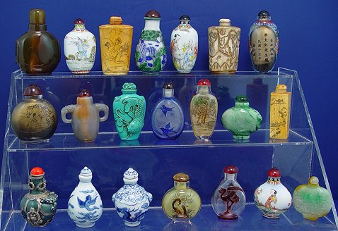 SNUFF BOTTLE COLLECTION: 21 bottles ranging from 2 1/8'' to 3 5/8'', to include reverse painting, carved stone, blue and white porcelain. Decoration to include, dragons, genre scenes, erotica, koi, etc. Display shelf with sliding plexi glass front, 16'' x 21'' x 3 1/2''.