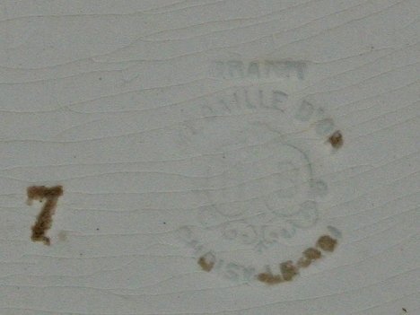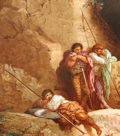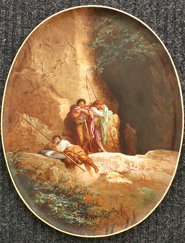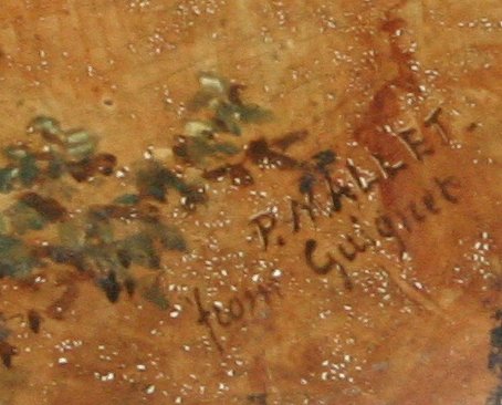 LATE 19th/EARLY 20th CENTURY CHOISY LE ROI PAINTED PORCELAIN OVAL PLAQUE: Impressed mark verso, 15 3/4'' x 12 1/4'' by P. Mallet after Guignet depicting resting soldiers, signed on the bottom. Condition - Some missing chips of paint pinhead size.