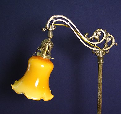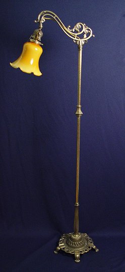 REMBRANDT FLOOR BRIDGE LAMP WITH CASED GLASS SHADE: Ornate floor stand signed Rembrandt under the base. The shade is cased amber glass, 58 1/2''h. overall, the shade is 6 1/2'' dia. at the ruffled rim. Est. $250/400**