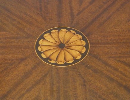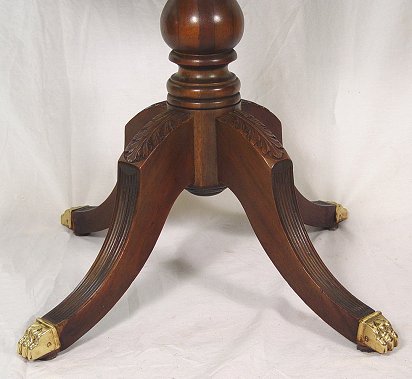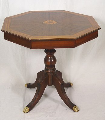 MAHOGANY PARLOR TABLE: Octagonal inlaid top centered by a rosette, turned pedestal with acanthus leaf design to knees of four legged base ending in brass paw feet. 32''dia., 28''h. Est. $250/350**