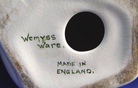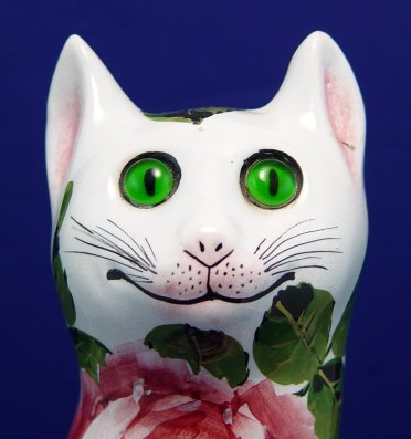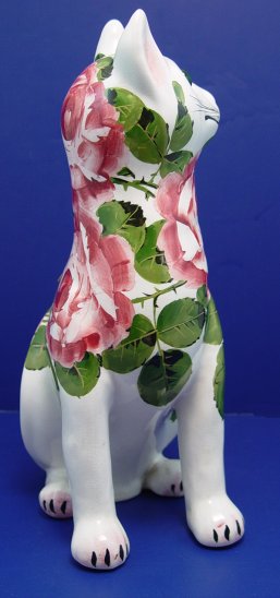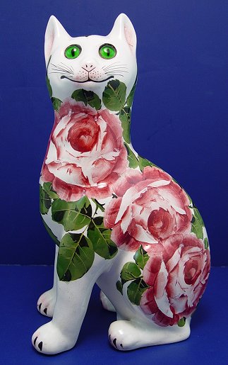 WEMYSS WARE CAT HAND PAINTED IN ROSES: Classic Scottish earthenware figure of a cat. Bold cabbage rose design, green glass eyes. Glaze crazing, no chips or cracks. Marked ''Wemyss Ware Made in England'' 13''h, base is 7''w.