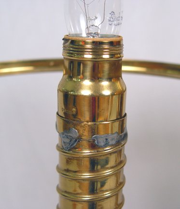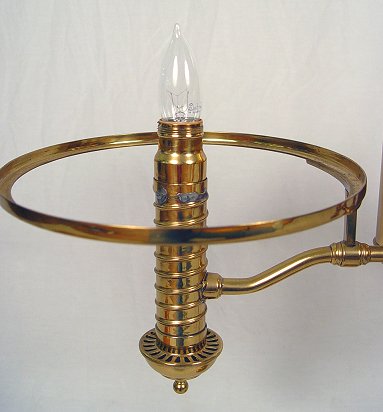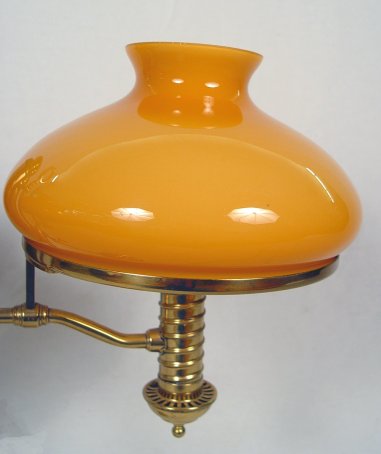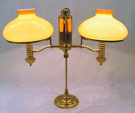 BRASS TWO LIGHT STUDENT LAMP: Cased glass shades. Removable shade rings, adjustable height. 23 1/2''h, 10'' dia. rims to the shades. 27'' w. span overall.