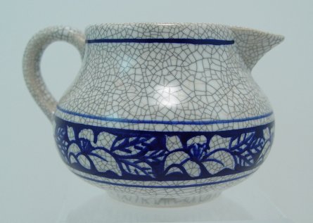 DEDHAM POTTERY PITCHER: Floral border, 3 1/2'' h. 3'' h. No chips or cracks.