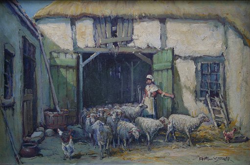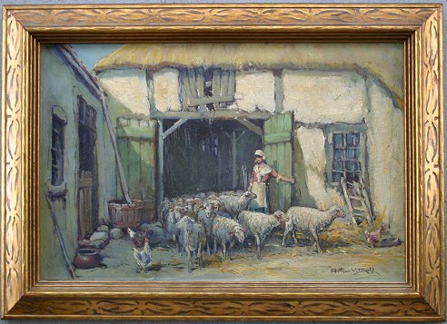 DIEHL, Arthur V., (American, 1870-1929): Shepherdess and her flock in a courtyard with chickens, 12'' x 18'', signed lower right, encased in period carved and gilded impressionist frame, 1 3/4'' width with minor wear. Condition - Needs cleaning.