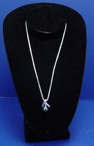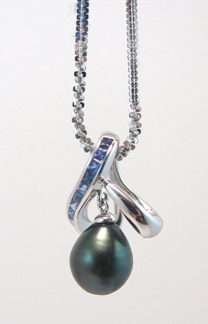 TAHITIAN PEARL & SAPPHIRE PENDANT: 12.5mm Tahitian black pearl in looped pendant of 18k white gold, channel set with princess cut sapphires in graduated shades of blue, marked ''HK K18 SO .64''. Currently on a 18'' twisted link chain marked 750, approx. 11 grams overall. Est. $400/600**