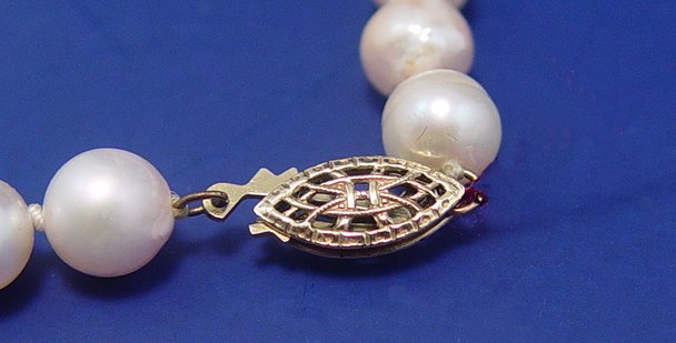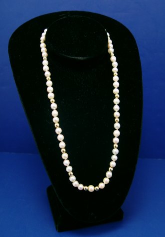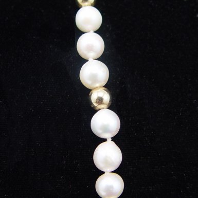 PEARL AND GOLD BEAD NECKLACE: 21'' strand of 7-7.5mm creamy white pearls double knotted with a 6mm gold bead every third pearl, 14k yellow gold clasp.