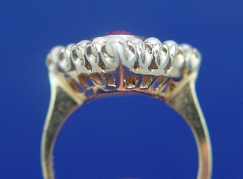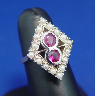 ANTIQUE RUBY AND SEED PEARL RING: Two natural rubies, approx. 1ctw, set in a rhombus shaped mount edged in seed pearls, 14k yellow (stamped). Size 5.75.