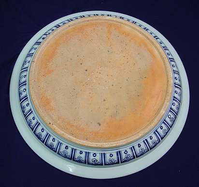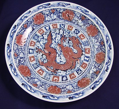 LARGE ORIENTAL RED, BLUE AND WHITE MING CHARGER WITH DRAGONS: WoW! What a Charger! Large and HEAVY. Dragons surround the bottom center of this impressive piece with a floral motif around the outer edges. 28''dia. x 4''h. Actual age unknown. Est. $400/600**