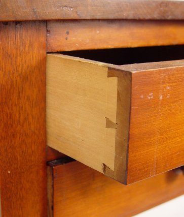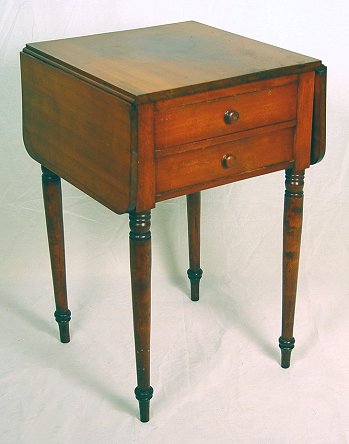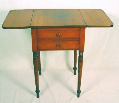 19th C AMERICAN CHERRY 2 DRAWER WORK STAND: Drop side leaves, 2 drawers. arrow feet on the legs. Drawers are dovetail construction with chamfered bottoms. 28 3/4''h, 18''w. when closed, 34 3/4'' w. when leaves are open. Straight tapered legs.