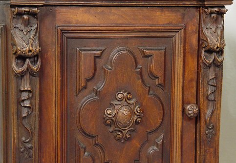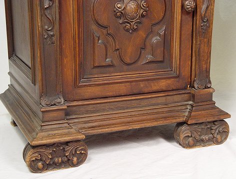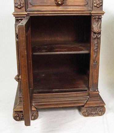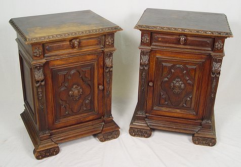 PAIR OF 19th C HEAVILY CARVED ITALIAN STANDS: Companion pieces to the large chest at lot #46. Carved head drawer pull on the single drawers. Cabinet door, shelved interior. 33''h. x 22 3/4''. Est. $800/1200**