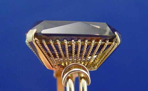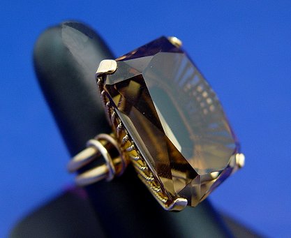 TREMENDOUS SMOKEY QUARTZ RING: Lovely emerald cut stone measuring approx. 25mm x 18mm x 11.5mm, set in hand crafted galleried mount of 18k yellow gold (assayed). Size 7.75, 14.9 grams. Est. $250/350**