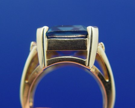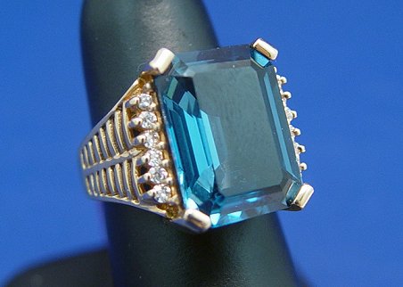 LOVELY BLUE TOPAZ RING: Emerald cut stone measuring approx. 16mm x 12mm x 6.5mm, set in mount of 14k yellow gold (stamped), accented by approx. 20pts of diamonds. Size 6.50, 10 grams. Est. $250/350**