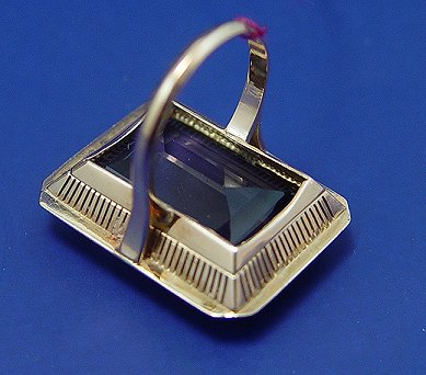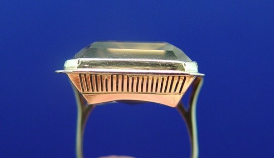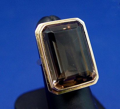 LARGE SMOKEY QUARTZ 14K RING: Emerald cut stone, approx. 25 x 18 x 9.5, bezel set in 14k yellow gold, size 7, 12 grams.
