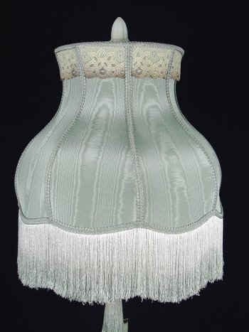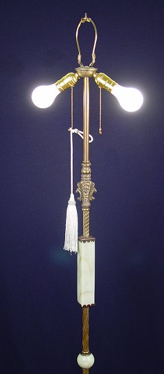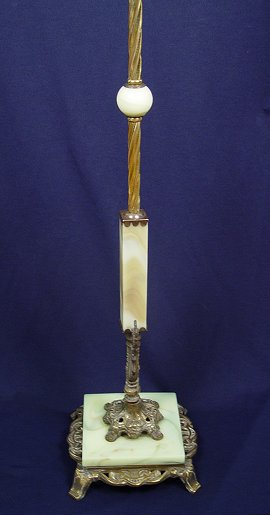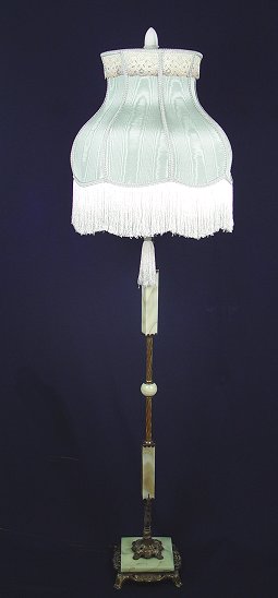 1920's GREEN SLAG GLASS AND BRASS FLOOR LAMP: Capped with an ornate fringed shade. 66''h. Est. $250/450**