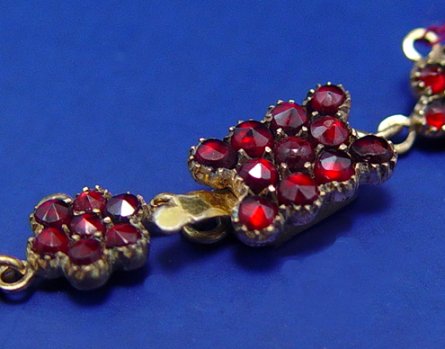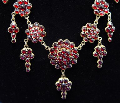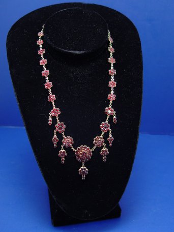 GARNET FLORAL NECKLACE: Lovely lavalier of garnets in a floral motif setting. Seven central flowers graduated in size and with floral and tear drop dangles. 17 1/2''l. One flower missing the center stone, loops available for safety chain.