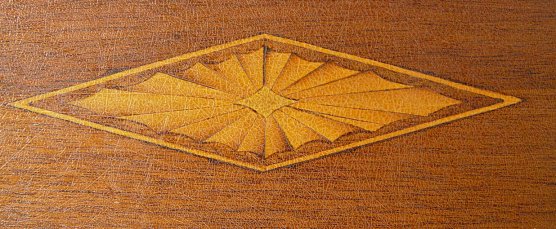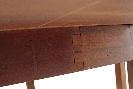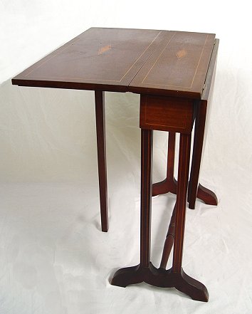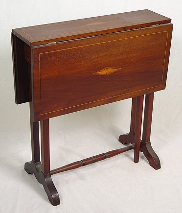 DIMINUTIVE INLAID MAHOGANY DROP LEAF TABLE: String and parquetry inlay mahogany table, swing legs, one drawer. Slightly alligatored finish. A mere 7 1/2'', 24 1/2''h. 23''w. when leaves are closed.