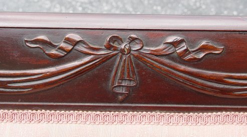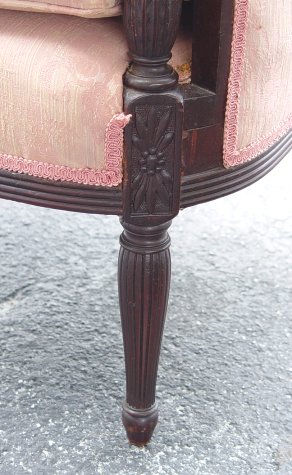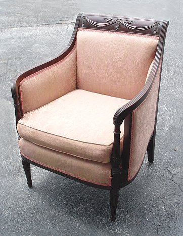 MAHOGANY FRAMED FRENCH PARLOR CHAIR: High back and sides, straight top rail with carving.