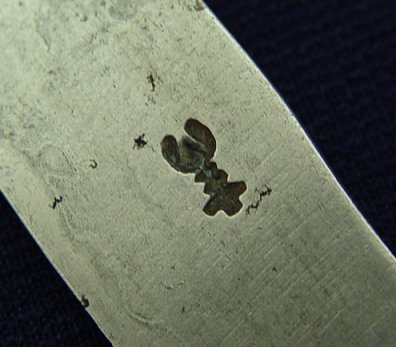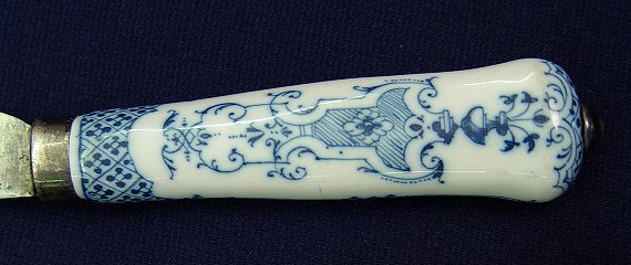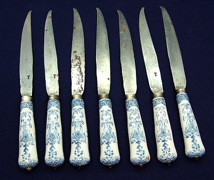SET OF 6 DELFT PORCELAIN HANDLE KNIVES: 19th C. Attributed to Delft. Original carbon steel blades in rusted condition, marked with unidentified Dutch logo. 10''l, overall, blades are 6 1/4''l. Two handles have a chip.