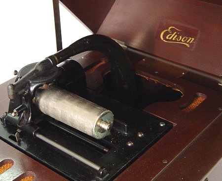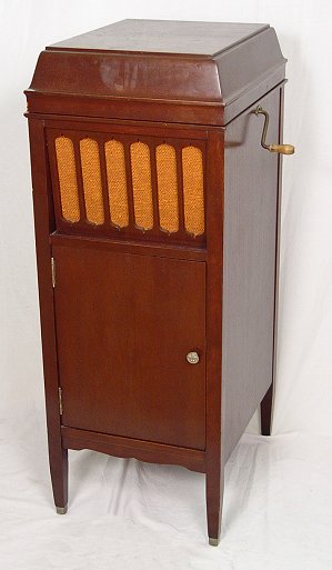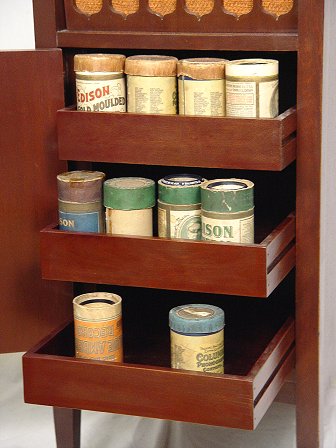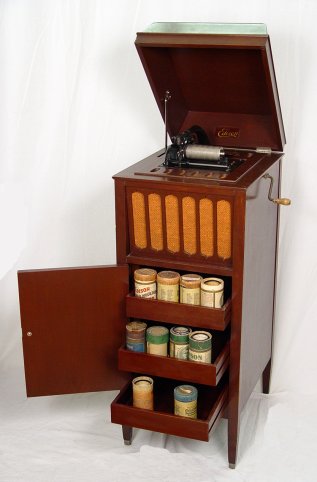 FLOOR STANDING EDISON AMBEROL CYLINDER PHONOGRAPH: Sold with 10 cylinder rolls. Mahogany case with interior storage for rolls. 41''h. x 16'' x 19''. In good working order.