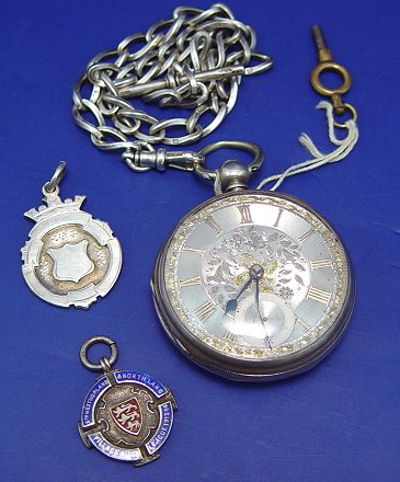 ENGLISH KEY WIND POCKET WATCH, CHAIN & FOBS: Dedicated ''Josh Burley 1875'', London leopard's head and lion passant marks with letter n dating manufacture to 1869. Serial number 11727 to works and case. Lovely wheel etched dial with gold? Roman numerals and floral edging. Missing second sweep hand, minute hand with bend. Working condition unknown. Sold with key! Currently on 13'' chain marked WWCo lion passant and date letter a, 1856?. Also with two fobs. 1)Dated 1904 I & T.C. 2)1913-1914 Westmoreland & Northlang Village Bill League, enameling to front, monogram to back ''J.R. Storey.
