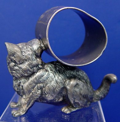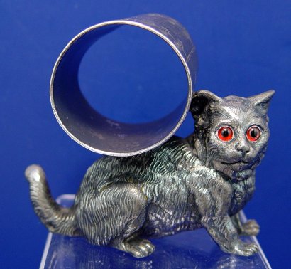 SILVERPLATED VICTORIAN CAT FIGURAL NAPKIN RING; Glass eyes, silver is worn with age. 3 1/4''h. No identifiers mark.