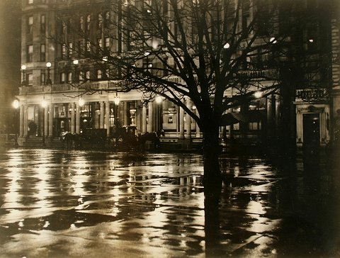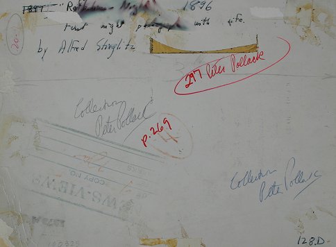 STIEGLITZ, Alfred, (American, 1864-1946): ''Reflections at Night, 1896'', Toned Gelatin Silver print , 7 1/4'' x 9 1/2''. Probably not a first printing, but certainly early 20th C. This is from Peter Pollac's personal collection. He was curator of photography at The Art Institute of Chicago for 12 years, and authored the book, ''The Picture History of Photography''. It is in this book that this particular photograph is illustrated.