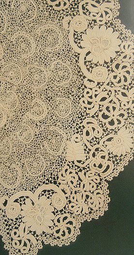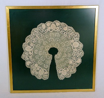 LACE COLLAR IN FRAME: Hand tatting at it best. Lace collar framed under glass with velvet backing. 31 1/2'' square overall.