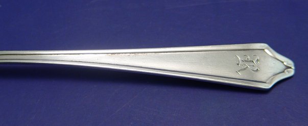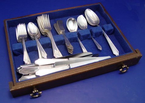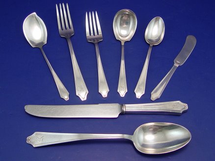 ''MINUET'' INTERNATIONAL STERLING FLATWARE: 46 piece service for 8 to include 8 dinner knives (9''), 8 dinner forks (7 1/8''), 8 salad forks, 8 flat butter, 10 teaspoons, jelly server, lemon fork, sauce ladle, and serving fork. Monogrammed R. Please note hollow handle knives have shallow pin size dents.
