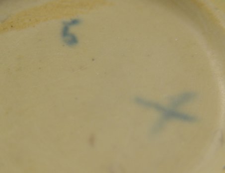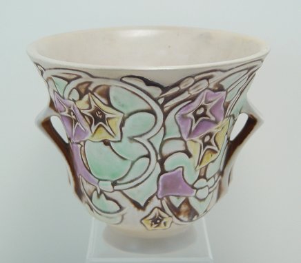 ROSEVILLE MORNING GLORY VASE: Flared double handled cache pot, 5 1/4'' h.