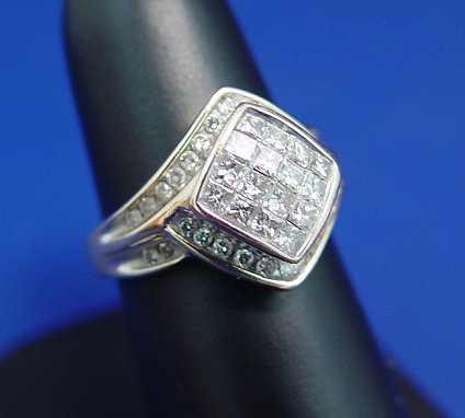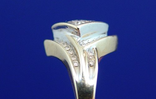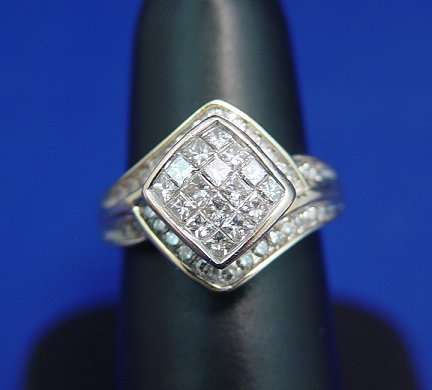 LADY'S FASHION DIAMOND RING: Sixteen small square cut diamonds invisibly set in a rhombus of gold, bypass mount of small round cut diamonds, marked 10k ADL, size 7, approx. 4.9 grams.