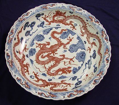 BLUE AND WHITE CHARGER WITH ORIENTAL IRON RED DRAGONS: Extraordinarily large and heavy piece with dragons surrounding this piece with a floral motif in blue. 26''dia. x 5''h. Actual age unknown. Est. $300/400**