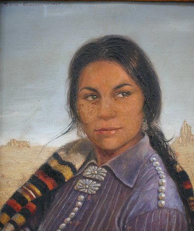 GARNER, Sara, (American, 1927- ): Portrait of young Native American girl, O/Masonite, 16'' x 14'', signed upper left and dated 1967, encased in painted frame, 22'' x 20 1/2'' with wear. Condition - Needs cleaning, looks like some water damage to the facial area, looks repairable.