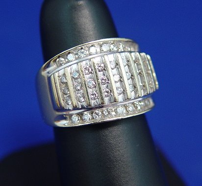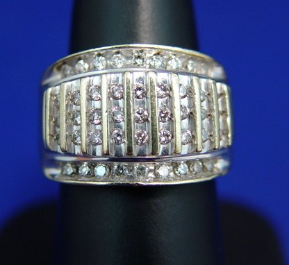 UNISEX DIAMOND RING: Flared top with nine obverse rows of three diamonds each, bound on each edge by a single row of nine diamonds. Forty five tiny diamonds set in wide band of 10k white and yellow gold. Size 7, approx. 5 grams.