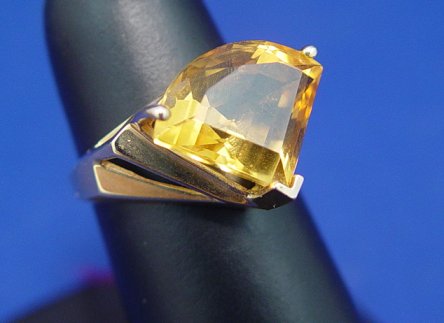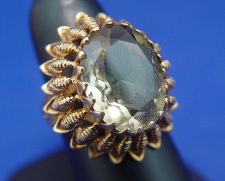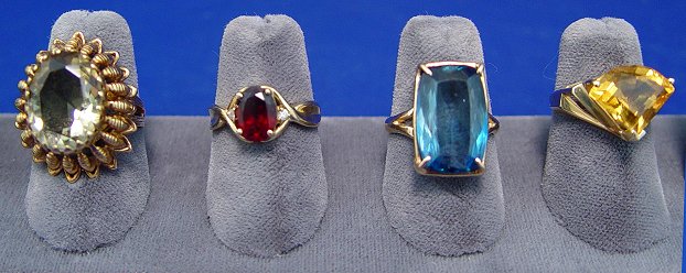 LOT OF LADY'S FASHION RINGS: To include, 14k yellow gold set with blue topaz, size 7.5. 14k yellow gold set with tri cut citrine?, size 6. 10 k yellow gold floral motif set with large smokey quartz, size 7. And a 10k yellow gold set with oval cut garnet, size 6.75. Sold as a lot.
