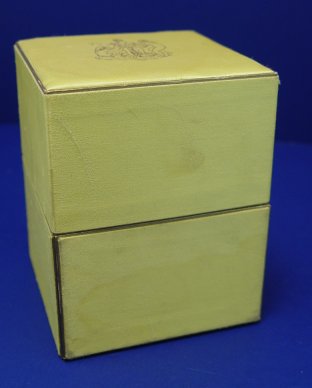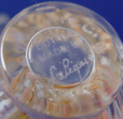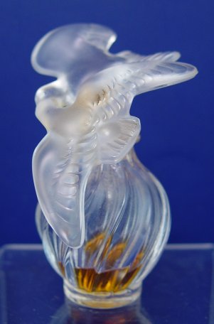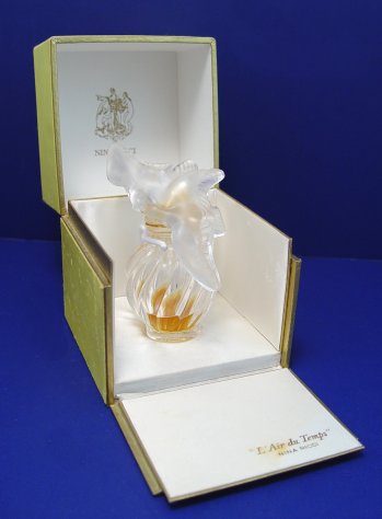 LALIQUE NINA RICCI L'AIR du TEMPS PERFUME BOTTLE: In the yellow presentation box (shows wear). The 4'' bottle is signed Lalique, capped with two doves. The box is 5''h.