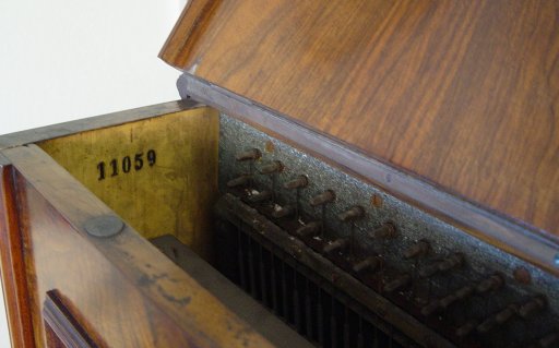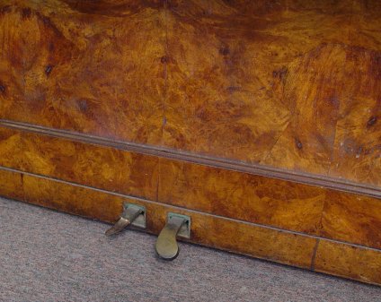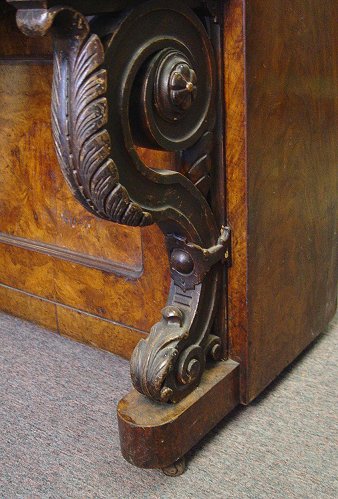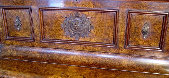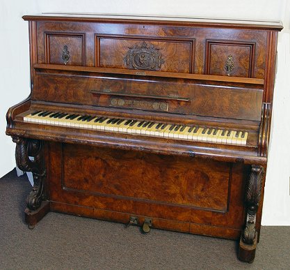 BURL WALNUT ED SEILER UPRIGHT PIANO ca. 1881-1890: Cherub decorated plaque centered by mounted candle sconces. Elaborate carved front leg columns. Ivory keys. The veneer damage to one side does not take away from the beauty of the burl walnut cabinet. Serial No. 11059. Approx. 49''h, x 54'' x 25''.