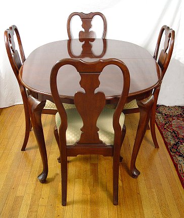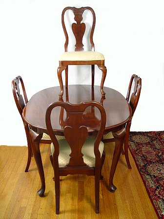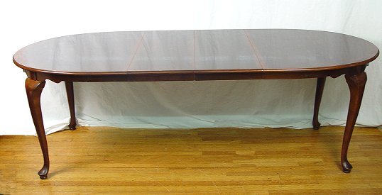 QUEEN ANNE STYLE BANDED MAHOGANY DINING TABLE AND 4 CHAIRS: Oval table, 64'' plus a pair of 14'' leaves.