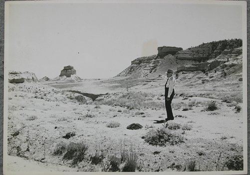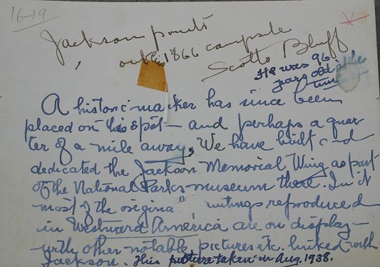 TWO PIECE PHOTOGRAPH LOT OF THE RENOWNED PHOTOGRAPHER W.H. JACKSON: One photograph is a portrait dated 1934 by Walters?, at age 92, measures 5'' x 4''. The next picture is Jackson in a landscape near Scotts Bluff, which is a historical part of the national parks in the Jackson Memorial Wing now, 4 7/8'' x 6 3/4''. This picture was taken in 1938, extensive biographical information handwritten verso.