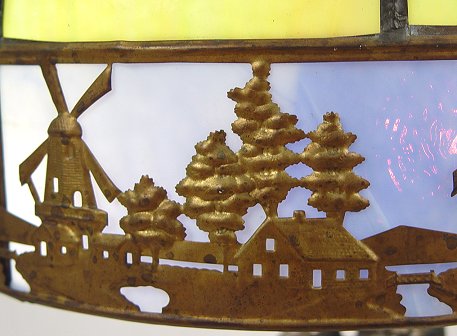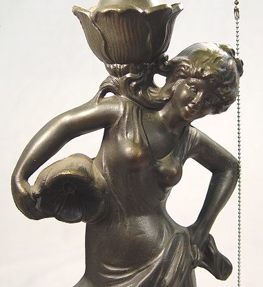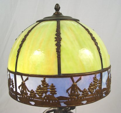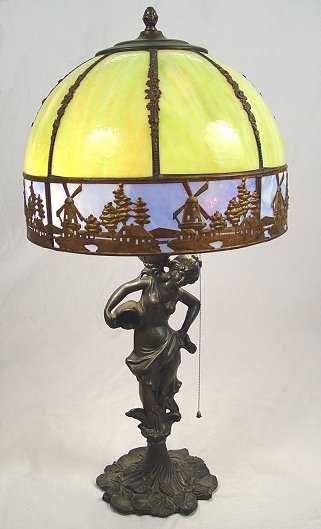 FIGURAL LAMP WITH VINTAGE SLAG GLASS SHADE: Bronzed finish on spelter on Art Nouveau type figure. Capped with a blue and green domed slag glass with windmill motif filagre. 2 pull chain sockets. Shade is 15'' dia., the lamp is 21''h. overall.