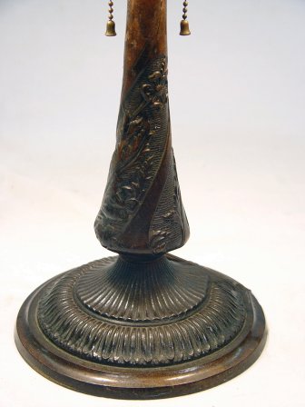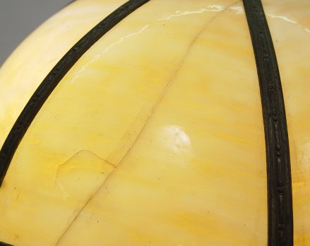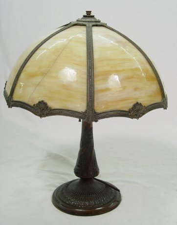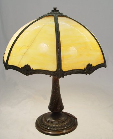BENT SLAG GLASS LAMP: Shade of six panels of bent carmel slag glass, one with crack, on a floral motif pedestal base in an antiqued bronze patena, bottom of base marked 1685, 15 1/2'' dia., approx. 21''h. Est. $250/350**